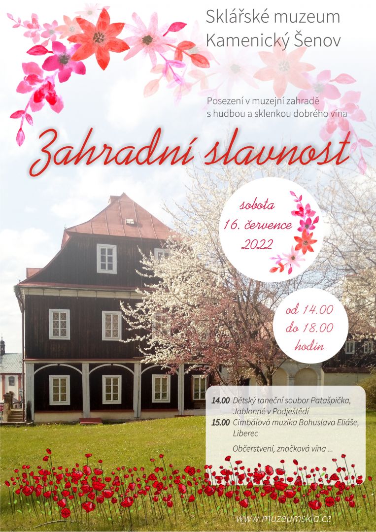 Dne 16.07.2022 se ve Sklářském muzeu v Kamenickém Šenově bude konat Zahradní slavnost s cimbálovou muzikou Bohuslava Eliáše z Liberce. Program zahájí ve 14.00 hodin vystoupení dětského tanečního souboru Patašpička z Jablonného v Podještědí. Pro děti bude také připravena výtvarná dílna.