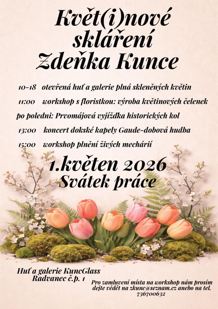 Zapraszamy do świętowania 1 maja w nietypowy i kreatywny sposób! Serdecznie zapraszamy do huty szkła i galerii Zdeňka Kunce w Radvanci, gdzie przygotowano dla Państwa bogaty program pełen sztuki, rzemiosła i rozrywki.